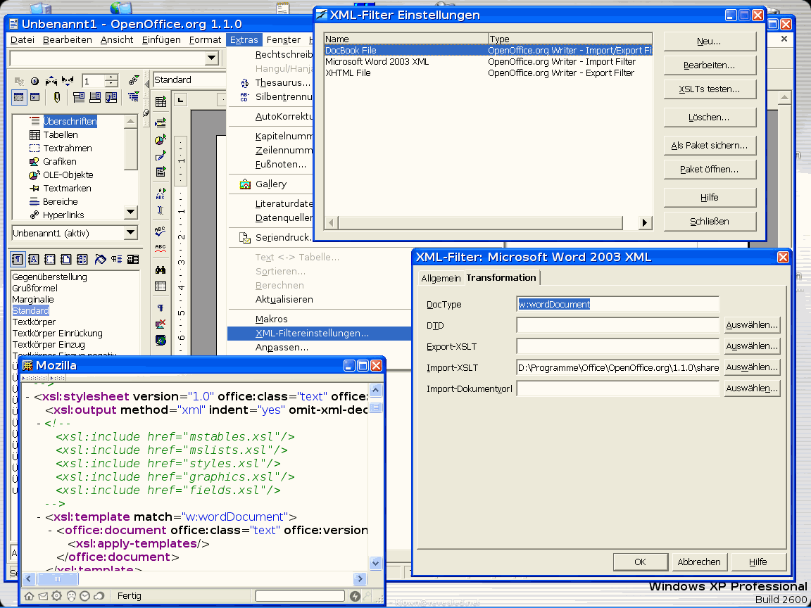 Grafik15 Der neue XML Datei-Filter erleichtert die Integration neuer Import-/Exportfilter, die auf XSL - Umsetzungen basieren. Ein beliebtes Anwendungsbeispiel für den XML Datei-Filter ist die Unterstützung des neuen Microsoft Office 2003 XML Dateiformats.